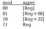 Если при этом в качестве базового регистра будет выбран EBР, то полученный режим адресации будет зависеть от поля MOD предыдущего байта. Возможны следующие варианты: