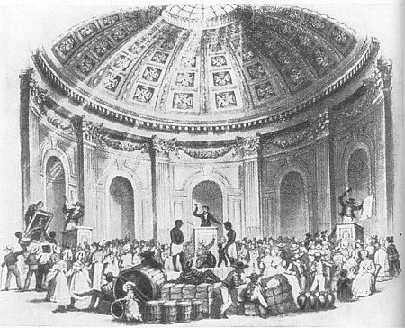 Аукцион по продаже имущества и рабов в одном из городов американского Юга. С гравюры начала XIX века.