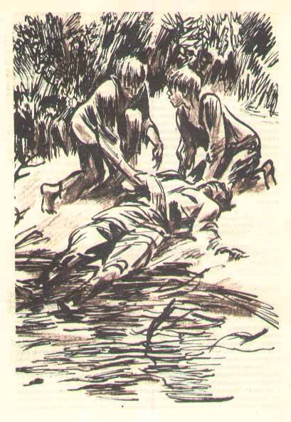 Течение прибило мальчишек к берегу чуть ниже поворота. Хватаясь за торчащие из земли обнаженные корни, они выбрались наверх, огляделись. Немцев не было. Пригибаясь на всякий случай, они побежали к повороту, легли плашмя и свесили головы вниз. Вода пенилась, крутила доски и мусор. А у самого берега висячие корни держали лейтенанта. Белое лицо запрокинуто, глаза закрыты. На мокрой гимнастерке возле плеча проступало розовое пятно. По ногам хлестала бурая пена, словно старалась стянуть с них сапоги.