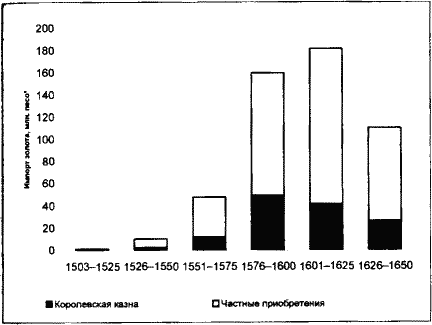 За 160 лет, между 1503 и 1660 гг., в Севилью было доставлено 16 тыс. т серебра. Запасы этого металла в Европе возросли втрое. За тот же период ввоз 185 т золота увеличил европейские ресурсы этого металла примерно на 20%. [139] Данные о поступлении драгоценных металлов в Испанию приведены на рис. 3.1.