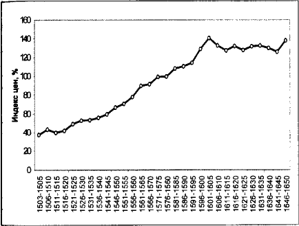 Источник: расчеты по: Hamilton E. J. American Treasure and the Price Revolution in Spain, 1501–1650. Cambridge: Harvard University Press, 1934. P. 34. Индекс цен взят из: Flytm DO. Fiscal crisis and the decline of Spain (Castile) // The Journal of Economic History. 1982. Vol. 42. P.142.