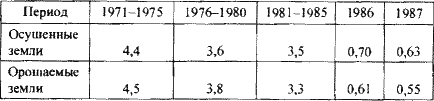 В 1986–1990 гг. для нужд мелиоративного строительства предполагалось произвести 35 тыс. экскаваторов, 32 тыс. бульдозеров, 10 тыс. тракторов типа К-700, 4,4 тыс. тракторов тяглового класса 10 тонн и выше, 22 тыс. скреперов, 6,3 тыс. автомобильных кранов и т. д. Редакциям центральных и местных газет, Государственному комитету по телевидению и радиовещанию, Государственному комитету по кинематографии было поручено обеспечить освещение в печати, средствами кино, радио и телевидения достижений в мелиоративном строительстве и эффективности мелиорации в реализации Продовольственной программы в СССР. [233] Результаты этой циклопической деятельности были скромными. С течением времени объемы выбывающих орошаемых и осушенных площадей почти сравнялись с объемами вводимых (см. табл. 4.3). [234]