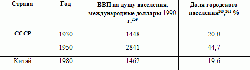 Показатели развития в 1930-е годы для СССР и в 1980 г. – для Китая были одинаковыми. К 1950 г. показатели уровня развития уже сильно различались (см. табл. 47). Душевой ВВП СССР в два раза превышал показатели Китая 1980 г. И все же большая часть населения страны еще жила в деревне.