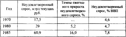 На этом фоне проблемы денежной системы нарастали. [275] Специалисты, изучавшие состояние потребительского рынка СССР, спорили о том, когда в СССР превышение совокупного денежного спроса над предложением товаров стало очевидным. [276] Госкомстат РФ, оценивавший объем неудовлетворенного спроса, исходил из гипотезы, что эта проблема появляется с 1965 г., до этого объемы спроса и предложения на потребительские товары были в целом сбалансированы. По расчетам, выполненным в этой организации, нарастание диспропорций на потребительском рынке выглядят следующим образом (см. табл. 4.10). То, что с середины 1960-х годов эта проблема становится все более острой, очевидно всем. [277]