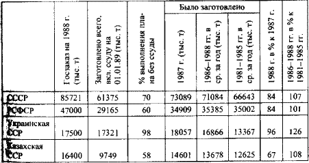 Министерство хлебопродуктов в правительство: «По состоянию на 1 января 1989 года в государственные ресурсы поступило 61,3 млн. тонн зерна при плане 85,7 млн. тонн. Государственный заказ недовыполнен на 30%, в том числе по РСФСР – 40%, Казахской ССР – 42% и Эстонской ССР – 52%. К уровню 1987 года снижение заготовок составило 11,9 млн. тонн или 16%, в том числе пшеницы заготовлено меньше на 217 тыс. тонн, ржи – на 860 тыс. тонн, гречихи – на 179 тыс. тонн, проса – на 551 тыс. тонн, зернобобовых – на 458 тыс. тонн, ячменя – на 7186 тыс. тонн и овса – на 928 тыс. тонн. […] В ряде областей при наличии в хозяйствах значительного количества намолоченного зерна имели место факты сдерживания продажи его государству». [371]