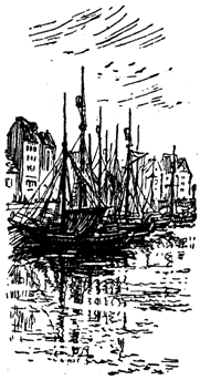 Громко перекликаясь, школьники шли по набережной. Всюду была суета: по мосткам ползли тачки с кипами тюленьих шкур, с грохотом катились тяжёлые бочки, обитые железными обручами. Гавань была полна волнующими запахами. Пахло смолой, солёным морем. Множество чаек с пронзительным криком пролетало меж мачтами кораблей, над набережной, над водой, покрытой маслянистыми пятнами. С моря шли маленькие волны, и ветер тихо гудел в реях, будто звал куда-то вдаль, на простор.