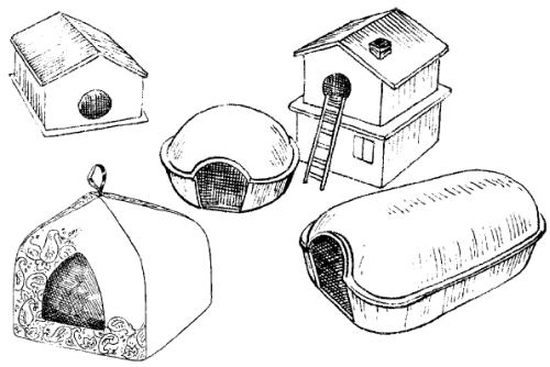 Гнездовые ящики можно выполнить в любом виде, чаще всего своей формой они напоминают домики. Их лучше подвешивать с обратной стороны, это позволит сохранить жилое пространство внутри клетки.