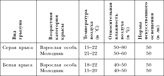 В домашних условиях температуру можно регулировать путем включения/отключения отопления, топкой печи. Оптимальные условия для разных видов крыс и возрастных категорий показаны в табл. 4.
