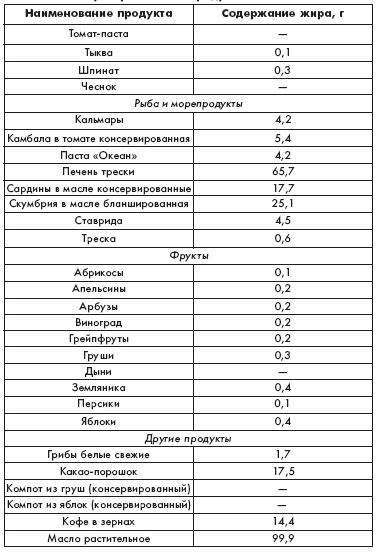 Содержание жира в часто употребляемых продуктах (в расчете на 100 г съедобной части).