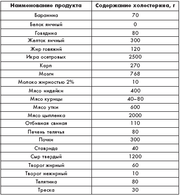 Количество холестерина, который содержится в некоторых продуктах, можно узнать из таблицы 9. Таблица 9 Количество холестерина, содержащегося в различных продуктах (в мг/100 г)