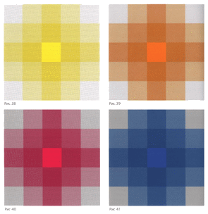 Рисунки 38…41 дают нам представление о тончайших световых возможностях контраста насыщения в хроматических модуляциях. Подобные упражнения могут быть выполнены и на основе размещений вместо серого цвета в угловых квадратах цветов, дополнительных к цвету центрального квадрата. При этом всё будет гораздо более ярким, чем при упражнении с серым цветом. Если мы хотим добиться выразительности всей композиции, используя только контраст насыщения без всяких иных контрастов, то блёклый цвет должен быть подмешан к яркому, то есть яркий красный должен контрастировать с блёклым красным, а синий яркий с блёклым синим. Но нельзя ставить вместе яркий красный с блёклым синим или яркий зелёный с блеклым красным. Иначе чистый контраст насыщения будет заглушен другими новыми контрастами, например, контрастом холода и тепла, и действие контраста насыщения с его тихой и спокойной выразительностью будет поставлено под вопрос.