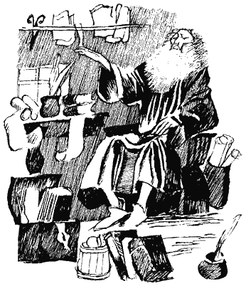 Тарен покорно последовал за старцем. Они вышли из кузницы, миновали курятник и вошли в белую, крытую соломой хижину. Здесь, в жилище Даллбена, на прогибающихся полках, на полу, вперемешку с закопчёнными кастрюлями, ремнями, гвоздями, витками струн и всевозможным хламом стояли, лежали, громоздились грудами и россыпью тяжёлые тома в кожаных переплётах.