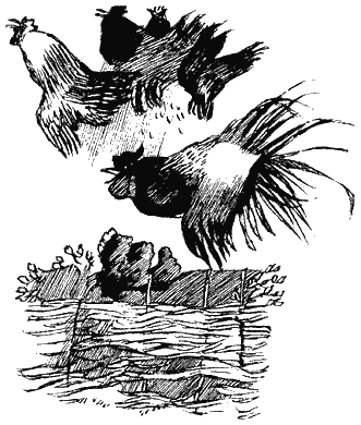 Пчелиное облако поднималось всё выше и выше, прямо к солнцу. В то же мгновенье Тарен услышал встревоженное кудахтанье и пронзительные крики птиц из курятника. Он обернулся и увидел пять кур и петуха, судорожно хлопающих крыльями. Прежде чем он сообразил, что они пытаются взлететь, куры уже были в воздухе.