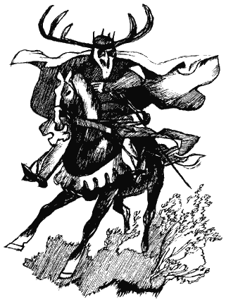 От неожиданности Тарен отпрянул назад. Над взмыленным конём возвышалась громадная фигура всадника. Тёмно-красный плащ пламенел за его обнажёнными плечами. Такая же кроваво-красная ткань покрывала его огромные руки. Застывший от ужаса Тарен увидел вместо человеческой головы рогатую морду оленя!