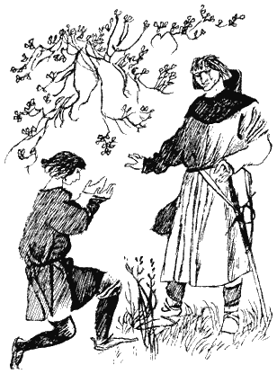 Солнце уже клонилось к западу, когда Тарен открыл глаза. Он лежал на сухом дёрне, укрытый плащом. Одно плечо ныло от глухой боли. Над ним склонился незнакомый человек. Поблизости щипала траву белая лошадь. Ещё плохо соображая, Тарен решил, что его взяли в плен страшные всадники. Тарен сжался. Мужчина протянул ему фляжку.