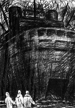Когда мы вышли из дыма, я услышал доносившиеся с плавбазы голоса и звон лебедок. Корма, подобная темной пещере, была открыта, и сквозь нее на полуют втягивали кита. Над нами выросли стальные борта судна, уже покрывающиеся ржавчиной. Сверху, на мостике, стоял человек в меховой кепке, держа у рта мегафон. Это был капитан Эйде.