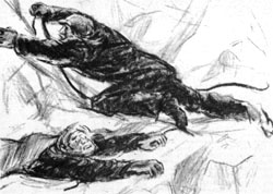 Я позвал трех человек с «Валь-4» и вместе с Кальстадом и Макфи двинулся на него. Он наблюдал за нашим приближением, и на одно мгновение мне показалось, что он не собирается драться. Вдруг он повернулся и соскользнул вниз по льду уступа. Я послал за ним Кальстада и остальных. Бланд стоял у вскрытого ящика и доставал из него винтовку.