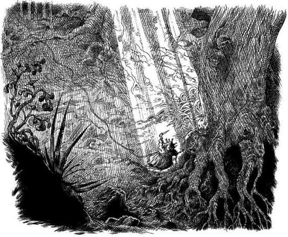 Крепко сжав рукоять, Спельда вытянула руку вперед, и, как требовал ритуал, острым лезвием отрубила кусочек от ближайшего дерева. Это была частица Дремучего Леса, которая должна открыть имя ее ребенка. Спельда действовала быстро: она прекрасно знала, что хруст ветки может привлечь чье-нибудь внимание и тогда дело для нее обернется очень скверно. Когда с ритуалом было покончено, она сунула кусочек дерева под мышку и поспешила обратно. Благополучно добравшись до Якорного дерева, она отвязала веревку и вернулась в свою хижину. Там она поцеловала кусочек дерева и бросила его в огонь.
