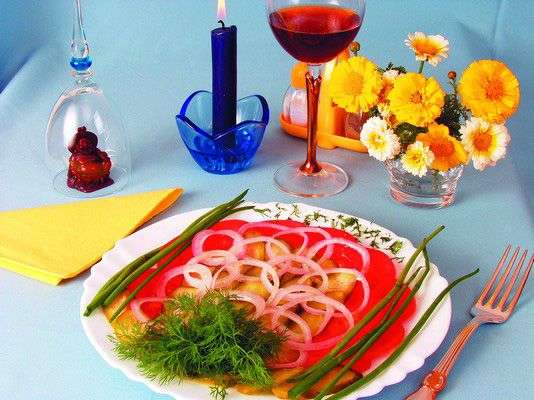2 помидора, 2 малосольных огурца, 1 луковица, 1 ст. ложка растительного масла, 1 ст. ложка лимонного сока, перец черный молотый, зеленый лук и зелень укропа для украшения, соль.