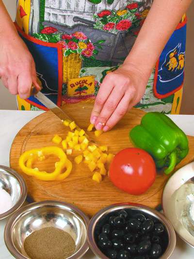 Перцы вымыть, удалить плодоножки и семена, затем от каждого отрезать по несколько тонких колечек для украшения. Оставшуюся часть перца нарезать мелкими кубиками.