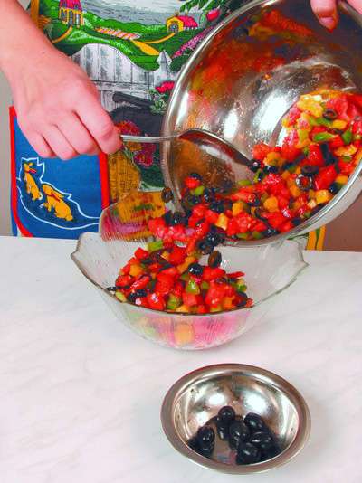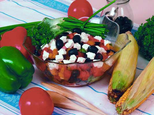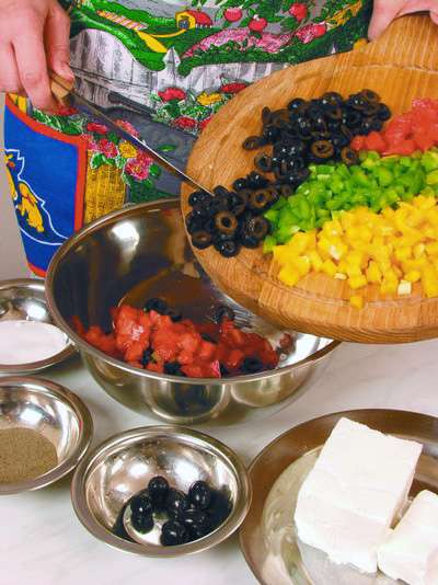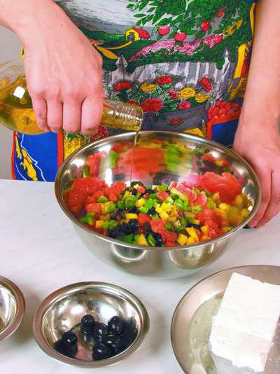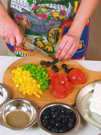 1 желтый и 1 зеленый болгарский перец, 1 помидор, 50 г маслин, 75 г брынзы, 1 ст. ложка растительного масла, зеленый лук и зелень петрушки для украшения, перец черный молотый, соль.