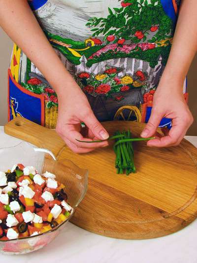 Для украшения салата из зеленого лука сделать декоративный пучок, перевязав его луковым пером.