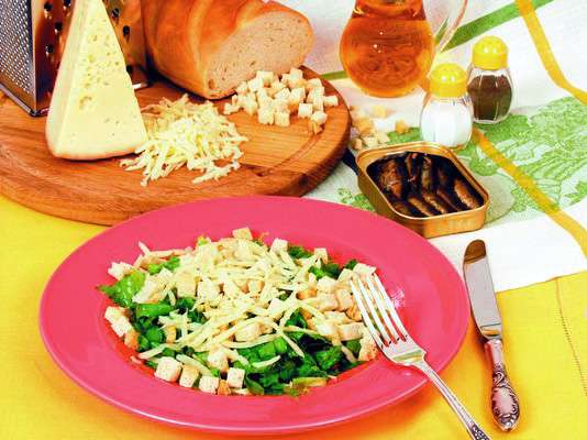Салат заправить растительным маслом и перемешать. Брынзу нарезать небольшими кубиками.