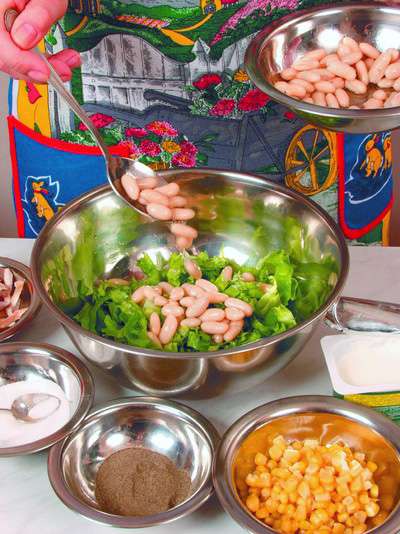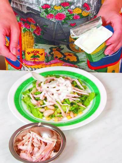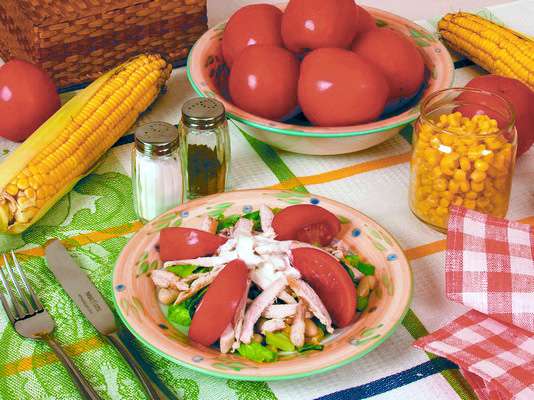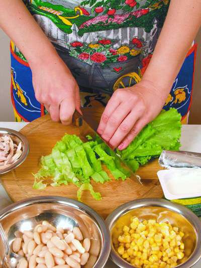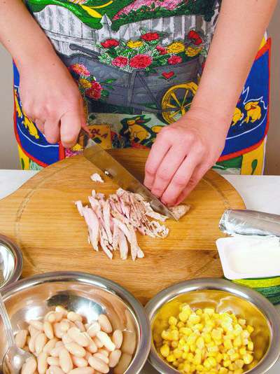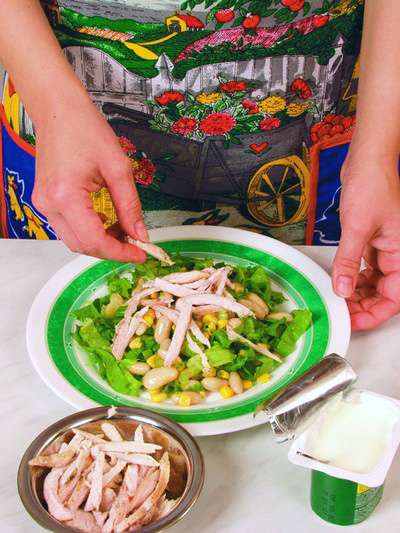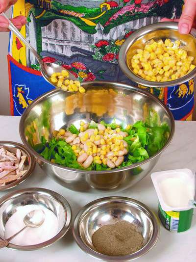 100 г куриного белого мяса, 50 г консервированной белой фасоли, 50 г консервированной кукурузы, 1 помидор, 2 ст. ложки растительного масла, 2 ст. ложки сметаны, 1 пучок салата, перец черный молотый, соль.
