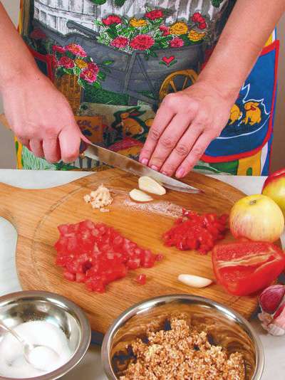 Чеснок очистить и измельчить с помощью ножа или натереть на мелкой терке.