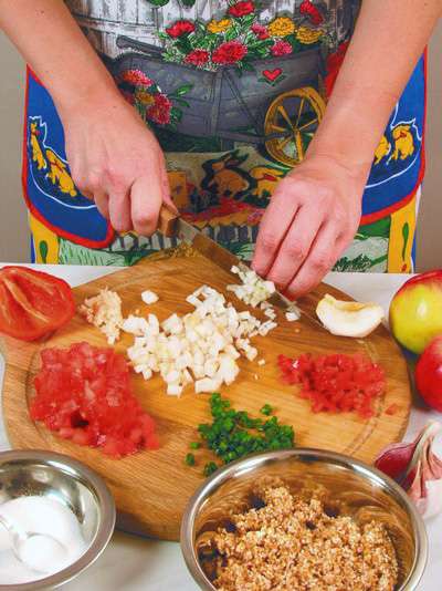 У болгарского перца удалить плодоножку и семена, мякоть нарезать мелкими кубиками.