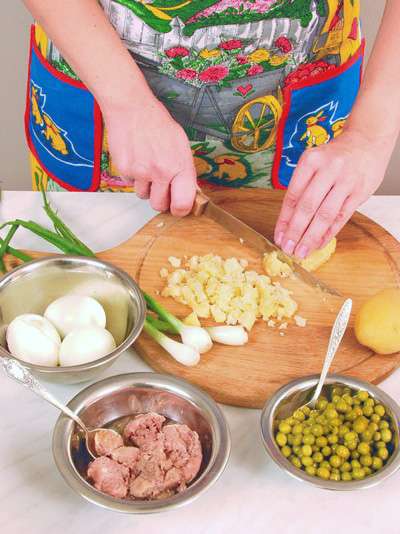 Картофель отварить, охладить, очистить от кожицы и нарезать мелкими кубиками.