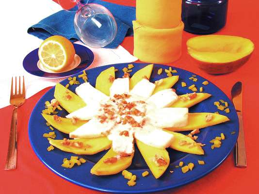Манго очистить от кожицы, удалить косточку, мякоть разрезать пополам, затем нарезать ломтиками.