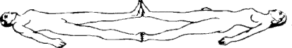 Ассистент захватывает ладонями ягодицы партнера и подтягивает копчик по направлению к пяткам, растягивая таким образом его поясницу. Или захватывает лодыжки партнера, поднимает ноги на 20 – 30 градусов от пола и немного вытягивает их, растягивая поясницу. Поправляет голову, чуть растягивая шейные позвонки. Если поясница все еще будет выгнута дугой вверх (а это можно проверить, подведя ладонь под поясницу партнера), то можно положить на живот партнера мешочек с песком для утяжеления и исправления изгиба поясничного отдела позвоночника.