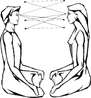 Сядьте напротив друг друга таким образом, чтобы между вашими коленями было около 20 сантиметров. Смотрите в глаза вашему партнеру, но таким образом, чтобы вы ощущали этот взгляд из самого центра вашей сущности.