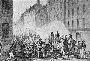 Баррикады на улице Эшелль в Париже во время революции 1830 г. (литография Свебаха).