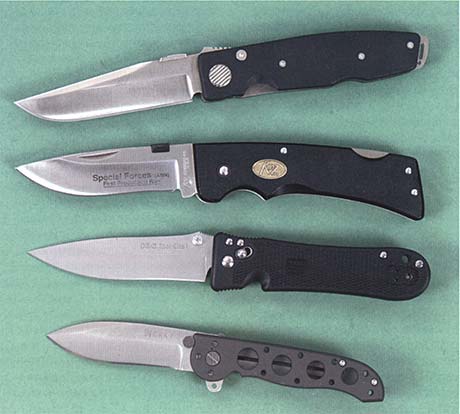 Различные приспособления, позволяющие открыть складной нож одной рукой. Сверху вниз: герберовский Michael Walker Tactical оборудован стальной прямоугольной накладкой на задней части обушка клинка, которую можно зацепить пальцем, открывая нож. Накладка на клинке Special Forces от Katz Knives пластмассовая и круглая, но идея остается та же. Этот нож можно открывать также традиционно, двумя руками, для этого в клинке сделан зацеп для пальца, как в дедовских складниках. Клинок SOG Spec-Elite оборудован высоким пеньком с острыми, агрессивно цепляющимися за палец боковыми поверхностями. А вот широкий и низкий пенек CRKT M21-02 цепляется за палец именно своим агрессивно нарезанным торцом. К тому же этот нож можно открывать вручную с помощью так называемого флиппера, выступающей из рукояти части клинка, при энергичном нажатии на которую нож открывается.