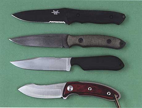 А вот несколько ножей с псевдогардой, если можно так это назвать. Роль «барьера безопасности» между рукоятью и клинком исполняет выступ стального клинка (хвостовика), как на двух верхних ножах, или пластмассовая облицовка рукояти (третий сверху нож), или все вместе (внизу). Ножи: Nightwing от BLACHHAWK, Hunter от BENCHMADE, S1 от F"ALLKNIVEN, Field Knife от SOG. Рукоять ножа S1 отлита в форме из термопластичной массы Thermorun Elastomer непосредственно на хвостовике клинка, проходящем через нее насквозь, так что задний конец хвостовика выступает за пластмассовую облицовку. Рукояти остальных ножей облицованы плашками, привинченными к вырезанному по форме рукояти хвостовику клинка. Все три рукояти разборные. Материал плашек ножа Nightwing — Zytel со вставками, отделанными очень шероховатым абразивным порошком, вплавленным в поверхность пластика. Рукоять ножа Hunter отделана плашками из стабилизированной древесины. Плашки рукояти Field Knife — это опять же популярный благодаря своим высоким потребительским качествам Zytel. Отформованная в прессформе шероховатая поверхность препятствует скольжению в ладони.