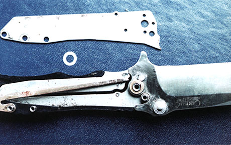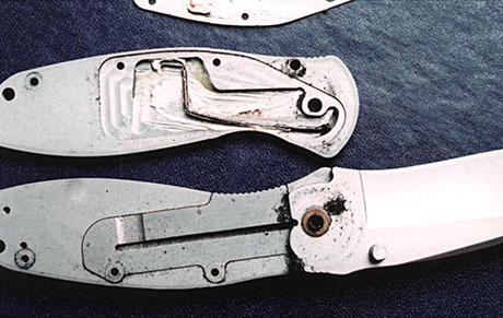 Ken Onion, главный дизайнер Kershaw, решил использовать Г-образную пружину, которая осуществляет выброс клинка на 900, и добился плавного, мягкого и очень стабильного открывания. Я использую 1750-ю модель уже почти четыре года, а 1670-ю — три года. И недавно специально проверял «резвость» пружины, сравнивая аналогичные механизмы новых и старых ножей: ощущение было примерно одинаковое, несмотря на то, что 1750-й пролежал без открывания около года. Вообще, полуавтоматы рекомендуется хранить в раскрытом виде. Специалисты Kershaw рекомендуют присылать к ним ножи для чистки прорези — направляющей для пружины. Действительно, если Г-образ-ная пружина выбрасывает клинок только на 900 и при этом она прочно прикреплена к клинку, значит, она должна иметь свободный ход для свободного прохождения клинком второй половины пути. А от плавности свободного хода будет зависеть, дойдет ли клинок до конца и заблокирует-ся ли замком. Конечно, на ножах Kershaw пружина спрятана очень надежно, и в область действия пружинного механизма не должно ничего попадать. Тем не менее 1670-я модель собрала немного пыли в свой механизм. Я разобрал его и почистил, рискуя потерять гарантию. Но, как оказалось, никаких трудностей со сборкой, а также и дальнейшей эксплуатацией ножа не возникло.