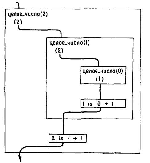 то получим в качестве возможных ответов все целые числа в порядке возрастания (0, 1, 2, 3,…), по одному числу каждый раз. Всякий раз, когда инициируется возврат (возможно, в результате ввода точки с запятой ';'), для предиката целое_числонаходится новое сопоставление, в результате чего его аргументу присваивается очередное целое число. Таким образом, это короткое определение порождает бесконечное число решений. Почему? На рис. 4.1, 4.2, 4.3 показана последовательность событий, приводящая к порождению трех первых решений. На каждом этапе самый нижний указатель (1) на рисунке указывает место, где впоследствии будет выбрано иное решение.Первоначально для ответа на вопрос имеется выбор между фактом 1и правилом 2. Если выбирается факт 1, то ничего более выбирать не придется, и мы получаем X = 0. В противном случае выбирается правило 2и ищется соответствие для цели, порождаемой этим правилом. Если выбирается факт 1, то завершается доказательство целевого утверждения с ответом X=1; в противном случае используется правило 2и снова ищется соответствие для появившейся подцели. И так далее. На каждом этапе первое что делает Пролог – это выбирает факт 1. Только при выполнении возврата он изменяет последний сделанный им выбор. Каждый раз, когда он это делает, он возвращается к тому месту, где в последний раз выбирал факт 1, и выбирает вместо него правило 2. При этом выборе появляется новая подцель. Факт 1представляет первую возможность для сопоставления с этой подцелью.
