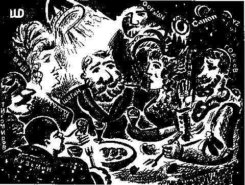 На следующий день все-таки стали митьков крупным планом снимать. Сам Гофман приказал: «Художников накормить!» Тут официанты забегали – принесли салатов, котлет по полной – мне цыпленка-табака. Но, говорят, делайте вид, что вам есть не охота, а разговаривайте на свои богемные темы – по сценарию. Жена моя Танюша, бледнея, говорит: «Ах, боже мой! – у меня все нервы поверху: завтра премьера!» А я на это что-то из Достоевского ввернуть должен. В общем, пока репетировали, все что могли – умяли. Господин Гофман приказывает: несите им еще жратвы, а то кадр получается ненасыщенный. Вдруг Распутин приходит – мы даже сначала испугались, а потом смотрим: шуба-то на нем из нашего фильма «Город» с Алевтинки снята. Видно, у них на студии одна шуба на всех. Тут Распутин начинает на баб кидаться и заставляет их шампанское из горла пить. Из-за соседнего столика вскакивает иностранный артист, переодетый под офицера, и говорит, обращаясь к Распутину: «Пан есть мразь и быдло!» Тут мне как-то обидно стало за Распутина. Что ж это иностранцы наших так обзывают? Хотел я было за русских вступиться, да меня Потемкин отвлек: расскажи, говорит, нашим телезрителям, почему Митьки у Гофмана снимаются? Тихомиров от лица Митьков отвечает, мол, славы нам, конечно, этот фильм не прибавит, а вот деньжат, конечно, хочется по-легкому срубить! И действительно – целые мешки денег волокут и отдают их цыганам и Михалкову. А Митькам, говорят, и другим артистам из Питера после праздничков выдадут на студии. Но вот прошли празднички, и другие празднички, и третьи, а нам отвечают: звоните после. И вот после Нового Года Кузя специально смотался на Ленфильм – спрашивает: «Дык, сколько ж можно ждать?» Ему отвечают: «А нечего сюда ходить – не будет вам ничего». Заплакал тогда Кузя и пошел куда глаза глядят.