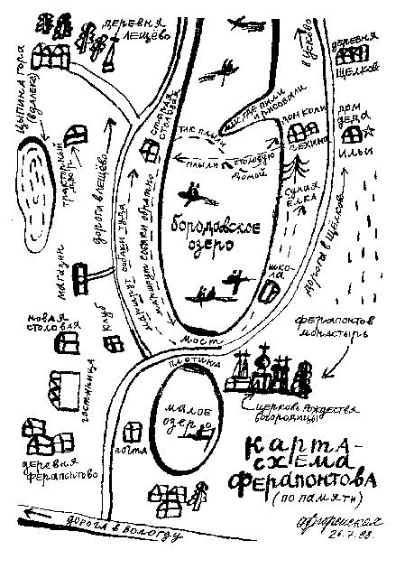 Мне позвонили из журнала «Огонек» и попросили написать текст о влиянии деревни Ферапонтово на жизнь и творчество митьков и их друзей. Попробую… Действительно, в восьмидесятых годах несколько художников из группы «Митьки» провели некоторое время в деревне Ферапонтово Вологодской губернии (а также соседних деревнях Щелково и Лещево) не без удовольствия и не без пользы. Считается, что мы ездили туда рисовать всякие пейзажи с натуры и как бы наслаждаться тихим совершенством деревенской архитектуры и неброской красотой фресок работы Дионисия. Фрески, кстати, на всем протяжении отчетного периода были упорно заперты – так что, увы, если не считать росписи портала, доступной хоть ежедневно, побывать в церкви Рождества Богородицы митькам удалось только пару раз – минут по пять. Однако невероятно красивое озеро, монастырь, как его можно видеть с мыса деревни Щелково, факт наличия удивительных фресок где-то неподалеку, вино «Вечерний звон», увлеченное рисование пресловутых пейзажей и молодые московские художники «по совокупности» создали ощущение, что деревня Ферапонтово Вологодской губернии – самое прекрасное место в России. Да мне и сейчас так кажется…