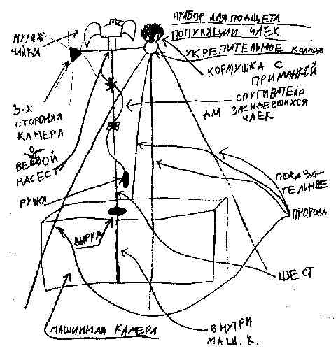 Являет собой независимую, в спокойном состоянии открытую каморку, могущую в случае нужды вместить в себя одно лицо (человеческое тело), свободно сочетающуюся с аэропланом и включающую в себя крепкую раму, прочно укрепленную элементами бортовой оснастки, где тут же имеются надуваемые газом приспособления в виде подушек, для пущей безопасности приделанные за углы к вышеописанным элементам и формирующие собою собственно пол, стены и потолок спасательной каморки, двери которой к тому же устроены так, чтобы очень прочно запирались.