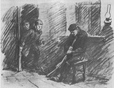 Братья на цыпочках пошли вдоль стены в ту сторону, где находилась комната Крутогоррва. Федька сделал шагов десять и неожиданно остановился. Ему показалось, что проснулся матрос. Карпуха натолкнулся на брата, и они оба оглянулись. Матрос спал. Он только подтянул под себя ноги. Мальчишки пошли дальше. Они миновали две двери. У третьей Федька снова остановился и сказал брату: