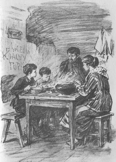 Есть очень хотелось, но мальчишки не торопили мать. Сколько её ни упрашивай, до возвращения отца обеда не будет. Они то и дело поглядывали в окно. А сытый ворон сидел на подоконнике и постукивал клювом в стекло. Вид у него был домашний. И не боялся он никого, только сердился и предостерегающе открывал клюв, когда кто-нибудь подходил к окну.