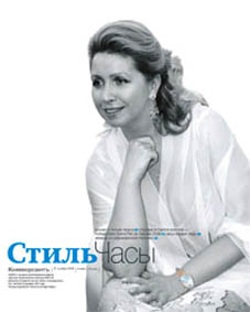 «Дмитрий Медведев показал себя большим любителем часов Breguet. На первой странице обложки дочь военнослужащего из Ленинграда выступает в знаменитых часах Breguet коллекции Reine de Naples с фазами Луны, маленькой секундной стрелкой, перламутровым циферблатом в золотом корпусе и серьгах Chopard цветной и оптимистичной коллекции Capocabana. Но как свидетельствует фото на этой полосе, она надевает и более скромные часы Breguet из коллекции Classique».