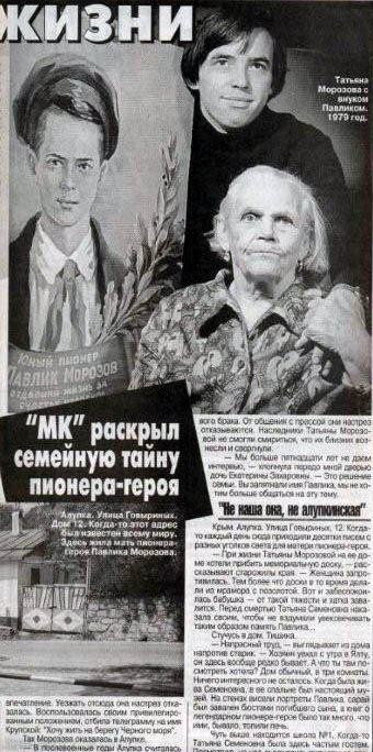 Между названными датами,19 мая, в день пионерского праздника в качестве презента ему в «Московском комсомольце» появилась статья Ирины Бобровой «Мать имени Павлика Морозова», свидетельствующая о том, что ненавистник убитого подростка Альперович (1933 — 2008) вовсе не умер, как не умерли и его соненавистники — Владимир Амлинский (1935 — 1989), Соломон Соловейчик (1930 — 1996), Натан Эйдельман (1930–1989), Федор Бурлацкий (1927 — ), Бенедикт Сарнов (1927 — ). Нет, не умерли физически или граждански, а только сменили пол и национальность (если Боброва русская), ибо едва ли не все названные джентльмены, увы, — евреи. Но в том, что они так скучковались, никто не виноват, ибо никто их не сгонял вместе, не принуждал, по доброй воле один за другим сбежались они потоптаться на могиле убитого подростка. Со слов Бобровой, следует приплюсовать еще израильтянина Михаила Лезинского. Какой получается ароматный, хотя и одноцветный букет! В таких случаях помянутый критик Сарнов, большой знаток русской классики, любит повторять вслед за Гоголем: «И подивился Тарас бойкости жидовской натуры…».