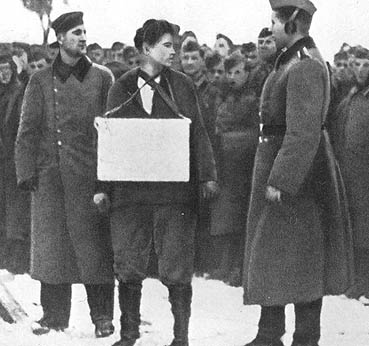 Вскоре судьба привела меня в родную деревню с надеждой взять немного картошки, зарытой предусмотрительно в подвале уже сгоревшего дома. Когда я вошел в деревню, в глаза мне бросилось большое скопление народу — немцев и мирных жителей. Около сарая была возведена виселица, к которой двигалась толпа народа. Ко мне подъехал верхом на лошади немец, ударил по спине плеткой и приказал присоединиться к толпе. Когда я оказался в гуще, то увидел Зою: растерзанную, избитую, обмороженную. Для меня, фактически еще ребенка, это зрелище было страшным. На Зою была надета телогрейка и ватные брюки. Ноги были в одних тонких носках, голова непокрытая, с замерзшими сосульками волос, а на шее висела доска с надписью: «поджигатель домов» и что-то внизу доски было написано по-немецки…