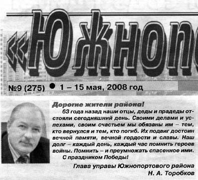 Н.А. Торобков, глава управы района. Он у меня упоминается первым не потому, что он — «глава», и даже не потому, что он пропечатан вместе со своим портретом на первой полосе в левом верхнем углу (каждый редактор, особенно главный, знает степень значения этого). Важны 9 строк его руководящего обращения к «дорогим жителям района» (значит, и ко мне, хотя каким образом я, живущий на «пенсионную дотацию», могу быть для него «дорогим»…). Попробуйте осмыслить первую фразу: «63 года назад наши отцы, деды, прадеды отстояли сегодняшний день». Оцените «связь времён»: социалистический Советский Союз в противостоянии фашистскому капиталистическому (в целом) Западу тогда — и неприкрыто бандитский капитализм сегодняшнего «оккупированного» Рашиленда! Я хорошо помню то время, и мне трудно представить, что его дед или прадед тогда хотели этого капитализма. Правда, можно попробовать предположить, что они могли быть из когорты тех, которые позднее «приложили руку» к развалу СССР, учитывая его, Торобкова, сегодняшнее мировоззрение и сравнительно удачное продвижение по административной лестнице. Но! — опасаюсь необоснованных предположений («Гипотезы я не измышляю».