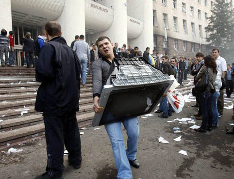 Естественно, кучка вчерашних студентов не справилась с этим митингом. Полные энтузиазма, они провозгласили его продолжение и заявили о начале «революции молодежи»; на второй день собравшиеся по их призыву прошли маршем через центр Кишинева, смяли (прикрываясь детьми и молодыми девушками) полицию. Согласие президента Воронина на пересчет голосов не остановило погромщиков; часть лидеров оппозиции, вначале направлявших и науськивавших толпу, довольно быстро перепугалась (правда, другая часть поощряла погромщиков призывами к продолжению «мирного протеста»), но было поздно. Толпа взяла штурмом администрацию президента и парламент и учинила в них сопровождавшийся поджогами дикий погром, в ходе которого были тяжело ранены десятки человек (всего сообщается о 270 пострадавших). При этом осквернялись и выбрасывались из окон государственные символы Молдавии, над зданиями были подняты флаги Румынии и Евросоюза, а погром плавно перешел в разграбление зданий под лозунгами воссоединения с Румынией. Мятежники разошлись ночью, оставив около двухсот человек жечь костры вокруг разгромленных зданий (при этом горели даже росшие рядом со зданиями ели); после этого их заняла полиция, арестовав, по имеющимся данным, 192 погромщика.