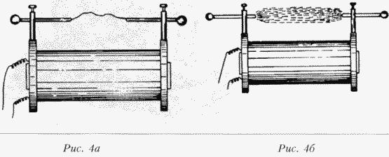 Во-первых, наблюдается слабый, очень чувствительный разряд в форме тонкой, слабой нити (рисунок 4а). Так происходит всегда, когда при высокой частоте, сила тока на первичной обмотке невелика. Несмотря на крайне малую силу тока, скорость изменений очень велика и, следовательно, разность потенциалов на полюсах вторичной обмотки значительна, так что дуга возникает на большом расстоянии; но количество «электричества», приводимого в движение, незначительно, едва достаточно, чтобы создать тонкую, нитевидную дугу. Она очень чувствительна, настолько, что даже близкое дыхание оказывает воздействие на нее, и, если ее не защитить надежно от потоков воздуха, она постоянно дрожит и извивается. Тем не менее в такой форме она постоянна, и когда полюсы сближаются, скажем, на одну треть длины разряда, ее довольно трудно погасить. Эта исключительная устойчивость при небольшой длине объясняется в основном тем, что дуга крайне тонка, поэтому, поверхность, подверженная потоку воздуха, очень мала. А большая чувствительность дуги, при большой длине, главным образом объясняется движением частиц пыли в воздухе.